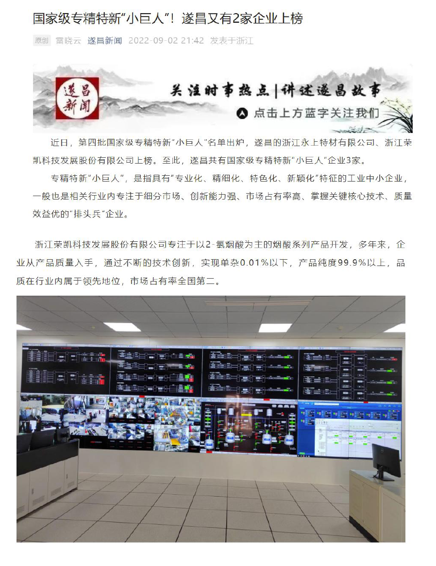 2022年9月,根據(jù)工信部《關(guān)于公布第四批專精特新“小巨人”企業(yè)和通過復(fù)核的第一批專精特新“小巨人”企業(yè)名單的通知》,浙江榮凱科技發(fā)展股份有限公司認(rèn)定通過。