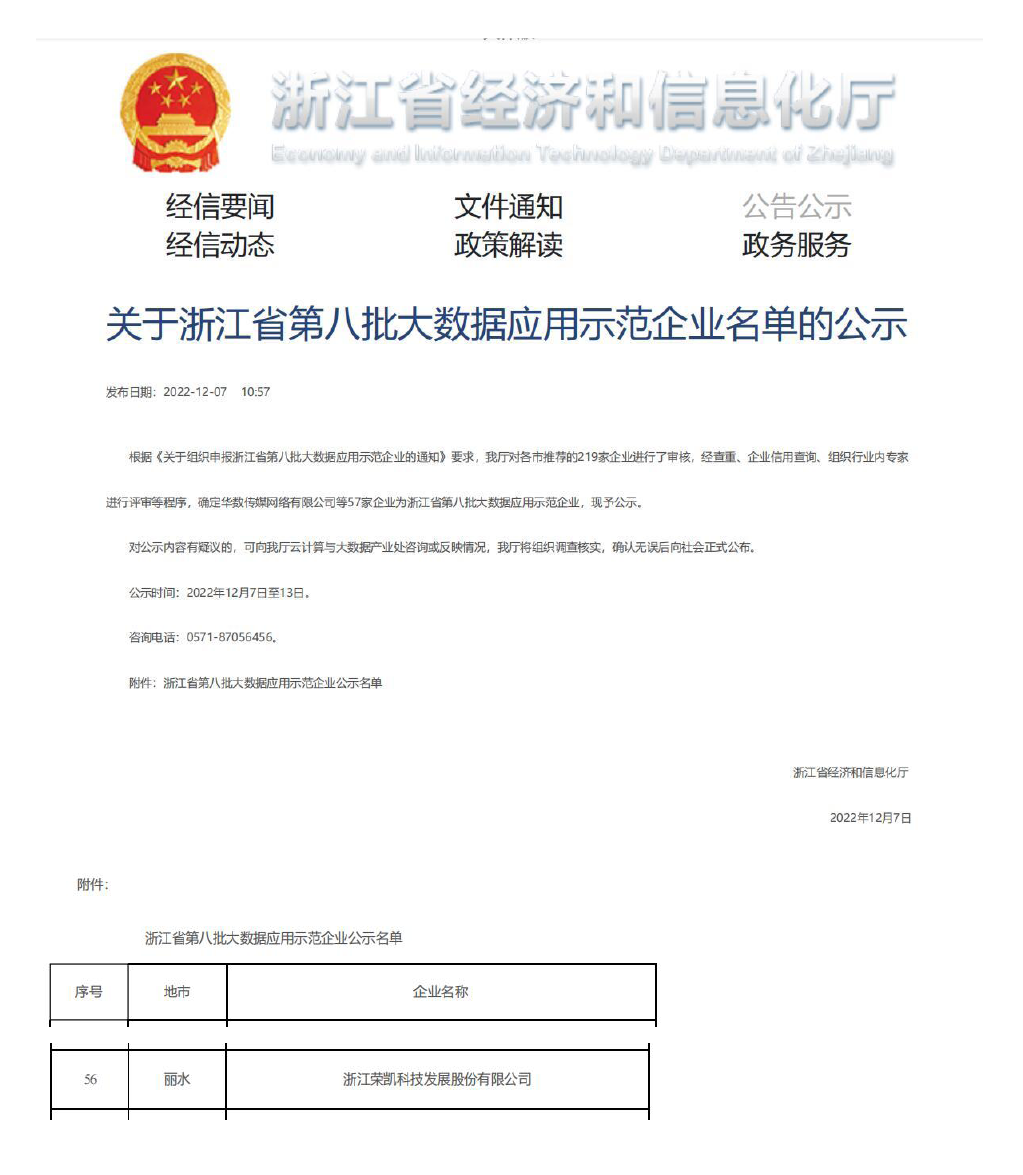 根據(jù)《關(guān)于組織申報(bào)浙江省第八批大數(shù)據(jù)應(yīng)用示范企業(yè)的通知》要求,浙江榮凱科技發(fā)展股份有限公司成功入選。